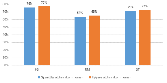 Kommunens utdanningsnivå er målt ved at vi ser på utdanningsnivået til foreldrene i hjemkommunen i samme kull, målt gjennom andel med høyere utdanning. Slik får vi et mål som kan kontrollere for en kommune-«peer effect» (Sacerdote, 2011), eller utdanningsnivået i miljøet der man vokser opp. Denne variabelen er standardisert med utgangspunkt i landsgjennomsnittet, med gjennomsnitt 0 og standardavvik 1.