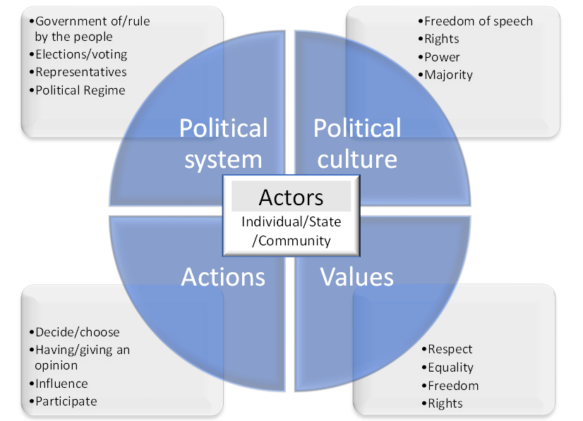The content analysis of the responses revealed five overarching dimensions of democracy. These dimensions include student teachers' own phrases describing democracy as a political system, democracy as political culture, democracy as values, and democracy as actions. Actors were part of all the descriptions and, therefore, made up a fifth dimension. In Figure 1, these dimensions are shown along with examples of typical terms used by the student teachers: