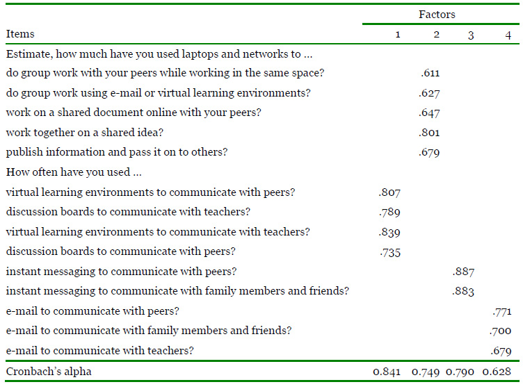 These four categories were used to create scales that were tested for internal consistency (Cronbach’s alpha; Table 1) and named as follows: 1) communication with peers and instructors using VLEs (VLEs), 2) laptop- and information network-aided collaboration with peers (collaboration), 3) communication by IM (IM), and 4) communication by e-mail (e-mail). The actual use of IM with instructors was practically non-existent (0.3% of respondents) and was therefore omitted from the factor analysis.