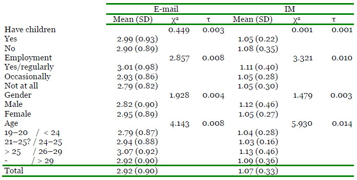 Significant differences in the self-reported use of e-mail with peers (Table 2) or instructors (Table 3) were not found between students with and without family commitments, employment status, genders, or different age groups. However, Goodman and Kruskal’s tau suggests that students working regularly or occasionally might have been somewhat more active users of e-mail for communication with peers than students not working at all. As far as the self-reported e-mail use for communication with family members or friends was concerned, the results indicate that having children, regular employment during term-time, and increasing age all significantly increased e-mail use (Table 4). Gender did not influence the self-reported use of e-mail with family members or friends.