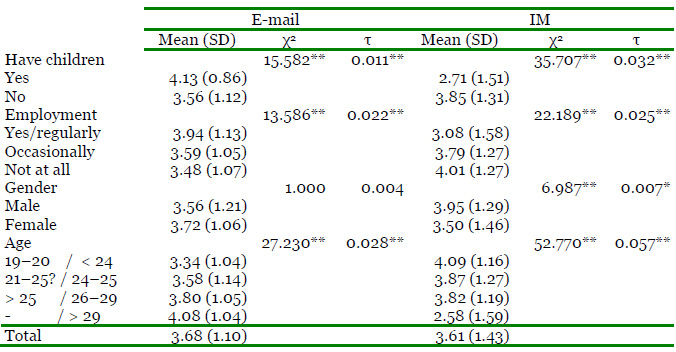 Students with a job or family commitments as well as older students used IM significantly less for communication with their student peers than other students. Although the frequency of e-mail use was at the same level among student groups, it should be noted that students without extra commitments probably use more face-to-face communication with their peers, which consequently decreases the need for CMC. Since most students with commitments make frequent use of IM for communication with their family members and friends (Table 4), the low use of IM with their peers (Table 2) suggests that communication through IM requires stronger ties than communication by e-mail. This conclusion is supported by the results of Mesch (2012) indicating that IM is primarily used to maintain existing ties rather than to develop new ones. However, these conclusions do not concur the results of Kim et al. (2007), who studied college students’ mean closeness in communication relationships by medium and ranked IM and e-mail use at the same level of closeness. The other explanation for the low frequency of IM use with peers might be that students with commitments find it hard to arrange a mutually convenient time for synchronous communication and collaboration with their student peers, or, that they prefer to study independently and follow their own schedules. Because the motivation for using IM would seem primarily to be social (Quan-Haase, 2008), it is unlikely that the low level of IM use with fellow students has an adverse effect on the successful outcome of the studies undertaken by these students. It could indicate that students with commitments have a low level of social support from their fellow students either by choice or because establishing strong social ties with peers is challenging for them due to their other engagements.