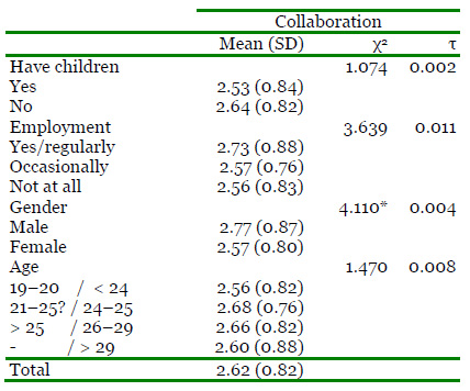 Note: Mean values (SD), the results of the statistical tests (Kruskal-Wallis chi square = χ2 and Goodman and Kruskal’s tau = τ), and their significance (* = p< 0.05, ** = p< 0.01) are also included.