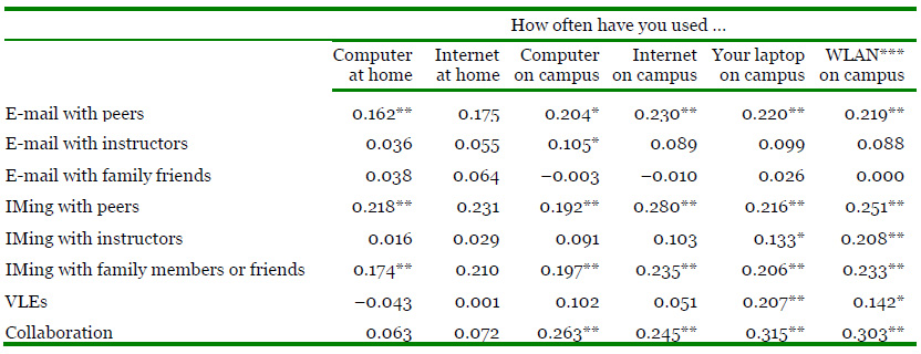 The results of the Spearman correlation analysis indicate that most collaborative work with laptops is conducted within the campus area (Table 6). The use of VLEs correlated only with laptop and WLAN use on campus, while the overall use of VLEs for communication was at a very low level and further conclusions based on this data should not be drawn. E-mail use with instructors and family members or friends was the only variable that in no way—or only to a negligible extent—corresponded to computer and Internet use measures.