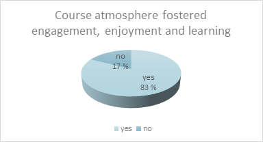 In addition, 83% of the students considered the course’s overall atmosphere to be fruitful, engaging and enjoyable from a learning perspective; thus, they appreciated the course’s tolerant and positive atmosphere (see Figure 6).