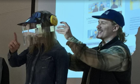 Figure 2. Left: A student trying out a HMD in a classroom setting. Right: Students demonstrating a lo-fi prototype of a head mounted display augmented reality application during a lesson.