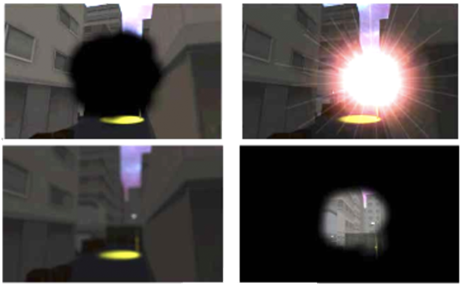 To explore the potential of HMD based VR as an educational tool for architects and space designers, we created a 3D virtual environment which designers could navigate via an interface which simulated visual disabilities. Our virtual environment was based on an urban street environment at night, as prior work indicates night vision is particularly problematic for the visually impaired (Klein, 1991). The implementation utilized an Oculus Rift HMD, with an Xbox 360 hand controller used to move around the virtual environment. Four visual disabilities were simulated, macular degeneration, cataract, myopia, and glaucoma (see Figure 1). The central symptom of myopia is blurriness, making it difficult to see objects clearly at a distance. Glaucoma often leads to severe loss of sight, and is characterized by tunnel vision. Cataracts result in a clouding of the eye’s lens and vision problems are particularly notable in the presence of bright lights. The vision loss caused by macular degeneration is often only partial, and focused on the central area of vision. Details of the implementation of the visual disability filters can be found in Väyrynen et al. (2016).