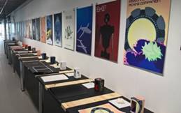 Figure 3. Left: Exhibition of students’ 3D printed physical concepts, packaging concepts and posters. Right: The students’ designs in a virtual reality exhibition space viewed with a laptop computer.