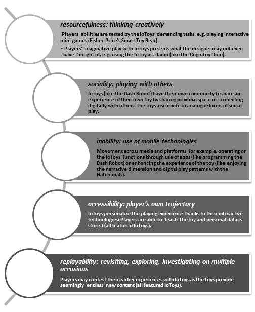 The nature of contemporary toy play is not only present in play patterns regarding the material dimensions of play, but also in its increasingly hybrid and social in nature (Heljakka, 2016). Furthermore, it has an increasingly transmedia quality. The concept of transmedia describes the complex relationships between media audiences, producers, and content (Alper & Herr-Stephenson, 2013). Again, transmedia literacy entails that learners derive meaning from the paths they make for consuming, creating, and sharing media elements. One way to understand the emerging field of IoToys and the play that happens with them, is to widen the aforementioned concepts of toy literacy, media literacy, digital literacy and finally, ludic literacy to the notions of transmedia literacy and understandings of play to the notion of transmedia play. Transmedia play refers to a “new way to understand how children develop new media literacies through their interactions with contemporary media that links stories and structures across platforms” (Alper & Herr-Stephenson, 2013). Learners not only construct their own meanings from transmedia messages, but also derive meaning from the paths they make for consuming, creating, and sharing media elements. Transmedia play is characterized by the following five facets, which makes it valuable for learning: resourcefulness, sociality, mobility, accessibility, and replayability (Alper & Herr-Stephenson, 2013). According to the researchers, the concept applies to media that has no storyline; for example, crossword puzzles or open-ended videogames (Ibid.). We suggest that the IoToys investigated in this paper demonstrate not only structured but also open-ended potentialities for play, and the play that happens with these connected objects may best be understood from the perspective of transmedia play.